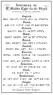 Шрифт Муна был разработан английским доктором Уильямом Муном (1818—1894), жившим в Брайтоне (Восточный Сассекс). После перенесенной в возрасте 21 года скарлатины он потерял зрение и, как многие люди, ослепшие во взрослом возрасте, считал шрифт Брайля неудобным.
