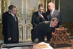 В книге Михаила Зыгаря «Вся кремлёвская рать» приведён рассказ Михаила Саакашвили о том, как Владимир Путин, показывая Константиновский дворец гостям саммита СНГ и Петербургского экономического форума, «случайно» встречал Шрёдера в винном погребе дворца[29].
