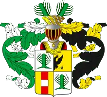 Над тем щитом стоит шлем с семью железными полосками коронованный баронской короной и с покровом шлемовным такой же краской, яко и герб украшен; на шлеме по обеим сторонам по одному древу, какое в первой и четвёртой частях на щите означено.