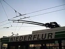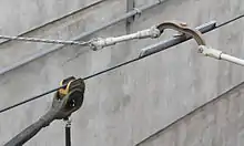 «Башмак» можно считать эквивалентом полоза на пантографе. «Башмак», как и сама штанга, закреплен шарнирно.