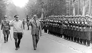 ![]() Генерал-полковник Штехбарт и генеральный секретарь СЕПГ Эрих Хонеккер обходят строй роты почётного караула МСП «Пауль Хегенбарт». 21 июля 1984 | |
