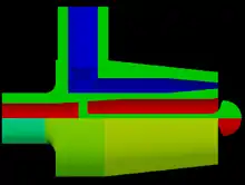 Штифтовая форсунка, через которую подаётся первый компонент топлива, располагается коаксиально в магистрали подачи второго компонента. Через внутренний канал форсунки первый компонент топлива поступает на распылитель и попадает в камеру сгорания широким конусом. Второй компонент в виде цилиндрического потока поступает по внешнему каналу, окружающему канал первого компонента. В некоторых вариантах в штифтовой (внутренней) части устроены отверстия для создания струй горючего[1].