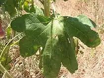 Нижние листья — крупные, сердцевидно-округлые, пальчато-лопастные; средние — пятилопастные; верхние — трёхраздельные; стеблевые — очерёдные; ворсистые, до 10 см в поперечнике. В год посева образует розетку листьев, на следующий год — 2—3 цветущих стебля.