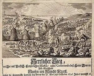 ![]() Гравюра «Блистательная победа русской армии у Перекопа 31(21) мая 1736 года». Бек Элиас. | |||