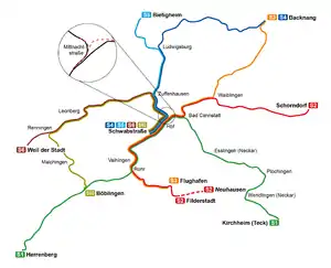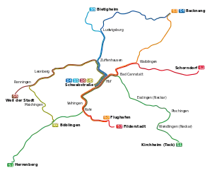 ![]() Схема линий S-Bahn Stuttgart по состоянию на 2014 год (пунктирными линиями указаны запланированные изменения сети) |