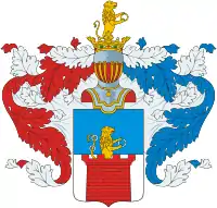 Над щитом два дворянских коронованных шлема. Нашлемники: правого шлема — три страусовых пера, из коих среднее — червлёное, на нём серебряный полумесяц вверх, над ним золотая шестиконечная звезда, а крайние — серебряные. Второго шлема — три страусовых пера, из коих среднее — червлёное, на нём вертикально, остриём вниз золотой меч, два крайних — лазоревые, на каждом по серебряной подкове шипами вверх. Намёт: обоих шлемов — червлёный с золотом. Щитодержатели: два древних русских воина в серебряном вооружении, держащие каждый по серебряному бердышу на зелёном древке[2].