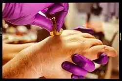 Снятие смеси. Воск обычно удаляют против роста волос, сахар — по направлению роста волос.