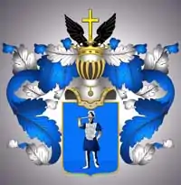 В щите, имеющем голубое поле, находится в серебряных латах воин, держащий пред собою в правой руке серебряную саблю. Щит увенчан дворянскими шлемом и короной, на поверхности которой изображён золотой крест и по сторонам его два чёрных орлиных крыла.