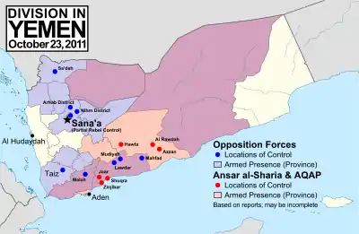 Моджахеды «Аль-Каиды» в среду, 17 августа 2011 года, взяли южный йеменский прибрежный город Шукра. Войска Салиха сопротивлялись исламским бойцам непродолжительное время. В результате боя они оставили город. Моджахеды «Аль-Каиды» въехали в Шукру на автомобилях из другого города, который находится под их контролем. Таким образом Шукра (на карте обозначен как Shuqra) стала оплотом «аль-Каиды» на Аравийском полуострове.[5]