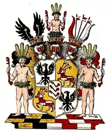 Щит увенчан графской короной, на ней три коронованных шлема. Намёт: слева золотой, подложен красным, справа красный, подложен серебром. На левой короне два красных воловьих рога, между ними серебряно-красные хоругви. На правой короне два чёрных орлиных крыла. На средней короне половина нагого дикаря, опоясанного зелёной повязкой из листьев, держащего в обеих руках по красной лапе грифа, на его голове венок из зелёных листьев и три красных страусовых пера. Щитодержатели: два нагих дикаря в зелёных набедренных повязках и венках на головах.
