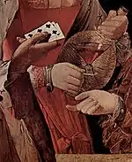 Знак о вводе в игру бубнового туза исходит от белой ухоженной руки дамы. Украшенная жемчугом она принадлежит к тем женским прелестям, которые завораживают жертву и завлекают её за карточный стол. На грубых руках служанки видны следы тяжёлой работы, а блестящие на её запястье камни слишком велики, чтобы быть настоящими. Из оплетённой соломой бутылки она наливает игрокам вино в дорогие бокалы венецианского стекла. Вино должно затуманить разум юноши, чтобы он не заметил ловкость рук карточного шулера.