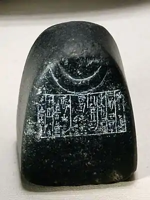 ![]() Вес в ½ мины (фактический вес 248 гр), введённая царём Шульги. Имеет изображение серпа луны; использовалась в храме бога Нанны в Уре. Диорит, начало XXI века до нашей эры (III династии Ура) | |
