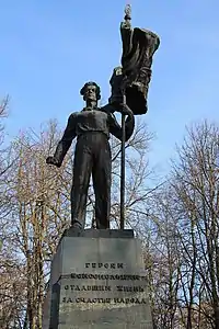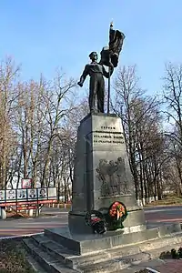 - Памятник комсомольцам Людиновской подпольной организации («Героям-комсомольцам, отдавшим жизнь за счастье народа»), открытый 18 сентября 1960 года, является центральным объектом Аллеи Славы[3], расположенной в центре Людинова, рядом с площадью Победы. Считается, что фигура комсомольца со знаменем в руке, стоящая на постаменте, олицетворяет собой Героя Советского Союза Алексея Шумавцова[4]. На постаменте помещён барельеф, а также тексты указов Президиума Верховного Совета СССР о присвоении А. Шумавцову звания Героя СССР (посмертно) и награждении (также посмертно) Орденом Ленина и Орденом Красного знамени других членов подпольной группы. Памятник является объектом культурного наследия России[5].