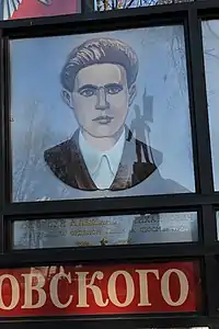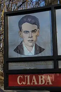 ![]() Портрет Алексея Шумавцова на стенде, посвящённом Людиновской подпольной комсомольской организации, на Аллее Славы в Людинове | |
