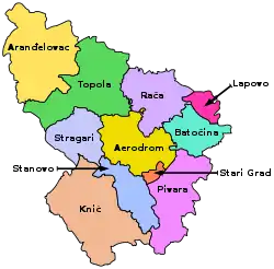 Другие города — Велика Плана, Варварин, Трстеник, Чичевац, Топола, Лапово, Младеновац, Лазаревац, Белановица и Лучаны. Белград также относится к Шумадии, но выделен в особый административный район.