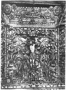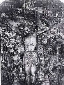 Распятие в резном ансамбле закреплено на семиконечном кресте[14]. Святой Праведный Иоанн Кронштадтский описывает подобный крест так: «семиконечный, с косым подножием и двумя верхними дщицами, но самая верхняя дщица совершенно закрывает верхний конец прямого дерева креста, представляя вместе с ним подобие буквы Т»[15]. Наиболее известными и почитаемыми из крестов подобной иконографии являются Дмитровский чудотворный крест (Государственная Третьяковская галерея); Кийский крест (храм преподобного Сергия Радонежского в Крапивниках, Москва); Чудотворный крест, установленный патриархом Никоном на Голгофе Воскресенского сбора Воскресенского Новоиерусалимского монастыря[16]. Известны два креста с Распятиями: из молельни при церкви Воздвижения Креста Господня и запрестольное Распятие из алтаря церкви Воскресения Христова (Воскресения Словущего) Большого Кремлевского Дворца.[17]