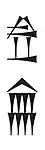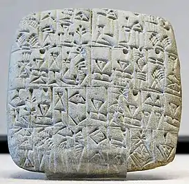 Клинописная табличка об административном учете с записями, касающимися солода и ячменной крупы; 3100—2900 годы до н. э.; глина; 6,8 х 4,5 х 1,6 см; Метрополитен-музей (Нью-Йорк)