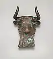 Украшение головы быка из лиры; 2600—2350 годы до н. э.; бронза инкрустированная оболочкой и афганского лазурита; высота: 13,3 см, ширина: 10,5 см; Музей Метрополитен