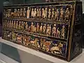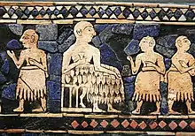 Штандарт войны и мира; 2600—2400 годы до н. э.; раковина, красный известняк и афганский лазурит на дереве; длина: 49,5 см; с королевского кладбища в Уре; Британский музей