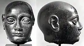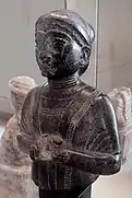Портрет шумерского пленника на стеле победы Саргона Аккадского, ок. 2300 года до н. э.[13] Причёска заключённых (вьющиеся волосы сверху и короткие волосы по бокам) характерна для шумеров, что также видно на Штандарте Ура[14], Лувр