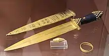 - Замечание Британского музея: «Бусины из золота и сердолика. Два бусина, выгравированные с белыми узорами, вероятно, были вывезены из долины Инда. Они были изготовлены по методике, разработанной хараппской цивилизацией» Фотография ожерелья под вопросом
