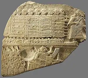 Стела коршунов; ок. 2450 года до н. э.; известняк; найден в 1881 году Эдуардом де Саржецем в Гирсу (теперь Телл Теллох, Ирак); Лувр