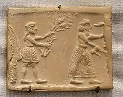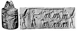 Цилиндрическая печать и оттиск, в котором предстает ритуальная сцена перед фасадом храма; 3500—3100 годы до н. э.; битумный известняк; высота: 4,5 см; Метрополитен-музей (Нью-Йорк)