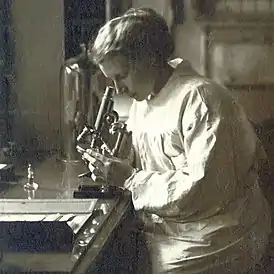 ![]() Агнес Шёберг за микроскопом. Фотография 1920-х годов | |