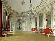- Кабинет с террасой (Terassenkabinett). Это помещение дворца было комнатой императрицы Елизаветы. Стены комнаты обиты французским шёлком.