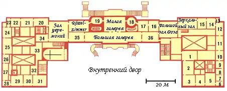 - Жёлтая комната. Кресла и в этой комнате покрыты шёлковым дамастом жёлтого цвета, стены также отделаны украшениями из золота. Замечательным в этой комнате является шкафчик, выполненный в стиле барокко, со стоящими на нём часами из белого мрамора и бронзы, покрытой золотом.