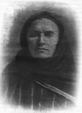 „Белолицая красавица с черными бровями, с проседью в тёмных волосах, высокая, дородная, но статная. Она никогда не снимала траур. Даже на праздники, если звали петь, приходила в чёрном. Песни пела, держа в руках неизменный бубен…“.