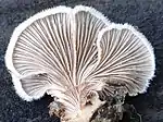 Шляпка в форме раковины, с тканью, сосредоточенной в точке крепления, что напоминает стебель. Часто волнистая, край твердеет при старении, жёсткая, волосатая и скользкая, когда влажная, серо-белого цвета, до 4 см в диаметре. Пластинки бледно-красные или серые. Произрастает преимущественно с осени до весны на мёртвой древесине в хвойных и лиственных лесах.