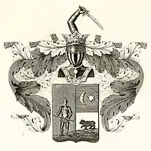 На щите, разделенном перпендикулярно надвое, в правой половине, в красном поле, находится воин в серебряных латах, держащий в руках копье, а в левой половине, в голубом поле, изображен золотой полумесяц, рогами обращенный к серебряной шестиугольной звезде, а под ними, в серебряном поле, чёрный медведь, идущий по земле в правую сторону.