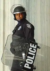 В дальнейшем, щиты получили распространение в полиции и тюремной охране. На рубеже 1960—1970-х годов противоударные щиты поступили на вооружение специальных подразделений полиции США, Японии и ряда иных капиталистических государств. Щиты обеспечивали защиту от ударов холодным и импровизированным оружием и метательных снарядов (камней, бутылок и т. д.)[10].