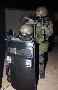 - передвижные (обеспечивают защиту от пуль автоматных и винтовочных патронов, используются в качестве средства коллективной защиты, перемещаются на колёсиках)[14]; в качестве примера, можно привести щит «PROTECH Phoenix IV», который находится на вооружении штурмовых групп Великобритании[14]