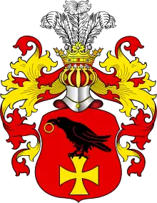 В красном поле золотой кавалерский крест, на котором ворон с кольцом в клюве.