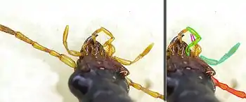 Голова жужелицы Paranchus albipes. Щупики максилл и нижней губы обведены лазурным и зелёным цветами, соответственно.