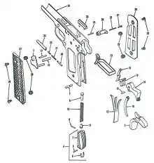 Разобранный пистолет M1911, щёчки — 27 и 28