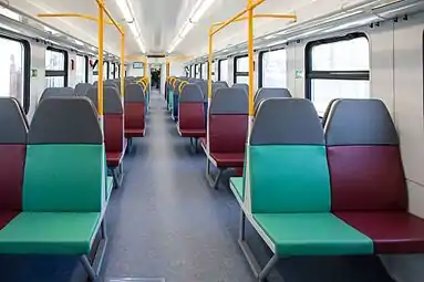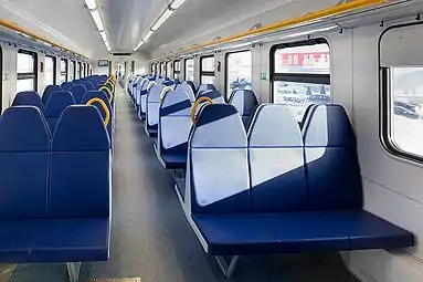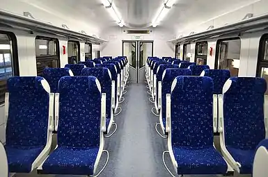 Сиденья в салоне расположены продольно в две линии по бокам от центрального прохода. В варианте экспресса устанавливаются мягкие односторонние кресла с наклонной спинкой, тканевой обивкой и подлокотниками друг за другом: в вагоне 1 класса — по два кресла в каждом ряду, а в вагоне 2 класса — по два в одном и по три в другом ряду. В пригородном варианте в салонах 3 класса устанавливаются двусторонние шестиместные диваны с прямой спинкой по три места с каждой стороны, на которых пассажиры размещаются лицом друг к другу, при этом сиденья в пригородных вагонах могут иметь несколько вариантов исполнения как по форме, так и по цвету (могут быть выполнены как однотонными, так и разноцветными), при этом в одном из вариантов исполнения часть сидений вблизи входа представляют собой четырёхместные диваны увеличенной ширины с более широким проходом с вертикальными поручнями, который может быть использован как накопительная площадка для проезда большего количества стоячих пассажиров (аналогично последним ЭД4М ЦППК)[9]. В головном вагоне за туалетом также могут располагаться откидные сиденья, устанавливаемые поперечно спинкой к стене, либо специальное огороженное VIP-купе, занимающее два окна с четырьмя кожаными креслами повышенной комфортности и переговорным столиком (в вагонах 1 класса)[24][20].