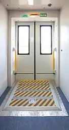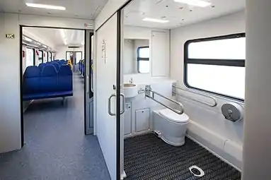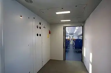 У головных вагонов между первым от кабины тамбуром и салоном расположен коридор. В прицепном головном вагоне коридор слева по пути в салон имеет боковое окно, справа имеется туалет для инвалидов (с увеличенной площадью и специальными поручнями). В моторном головном вагоне окно отсутствует, а его место занимают шкафы с электрооборудованием[23][20].