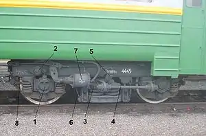 - Это связано с тем, что на ЭР9 в средней части моторного вагона располагается тяговый трансформатор, отчего тормозные цилиндры пришлось разместить на тележках.