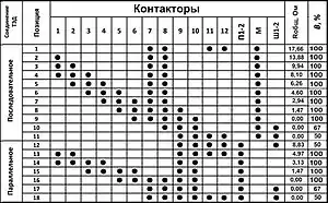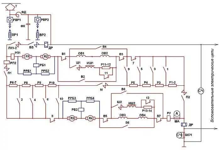 - Не указаны линейные контактора (ЛК1-2), так как в режиме тяги они постоянно замкнуты. Контакторы 11 и 12 силового контроллера на первой позиции замкнуты лишь для равномерной работы привода контроллера.