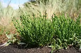 Типичным галофитом, довольно широко распространённым на юге Омской области, является солерос европейский — однолетнее травянистое суккулентное растение, имеющее водозапасающую ткань в стебле. Прорастание семян солероса часто начинается весной под водой, когда соответствующий участок поверхности котловины ещё покрыт слоем солёной воды глубиной до 0, 5 м. Побеги солероса европейского прямые или распростёртые, членистые, сочные, супротивно ветвящиеся, несут сильно редуцированные и почти не заметные листья. К осени растения солероса обычно сильно краснеют.