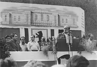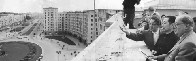 | Фридрих Эберт-младший даёт старт Национальной программе реконструкции Берлина, Сталиналлее, 16 октября 1952 года. | Эберт-младший и премьер Госсовета КНР Чжоу Эньлай на строительстве в Берлине, 24 июля 1954 года. |