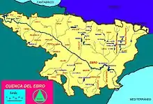 Река Эбро вытекает из Кантабрийских гор, пересекает Северокастильское плоскогорье, Арагонскую равнину и впадает в Средиземное море[1]. Длина — 928 км, площадь водосборного бассейна — 86 800 км²[2]; судоходство возможно лишь на незначительных расстояниях ниже Сарагосы; в виду этого, для обхода стремнин и мелей проведены параллельные течению Эбро каналы (Арагонский от Туделы до Сарагосы).
