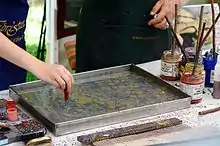 Поверхностью для создания рисунка служит вода. Чтобы краски не тонули и не смешивались, в неё добавляют экстракт гевеи. Краски, изготовленные из бычьей желчи и особых минералов, растекаются по поверхности. С помощью тонких палочек художник придаёт разводам нужный вид[1].