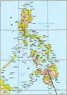 Оригинальный текст (англ.)[показатьскрыть]We were behind schedule and reached the north coast of Mindanao in broad daylight. It was a clear, dazzling day. Fortunately, no Japanese planes cut across the blue sky, though the enemy was known to make regular mail flights from Mindanao to Luzon. We were pretty conspicuous as the hours dragged on.— [60]