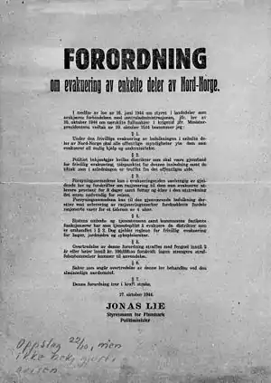 Эвакуа́ция населе́ния Се́верной Норве́гии — принудительное переселение гражданского населения Финнмарка и Северного Тромсё в октябре — декабре 1944 года немецкими оккупационными властями в связи с вступлением советских войск в Северную Норвегию. Всего было переселено за оборонительную линию в Люнгене около 45 тысяч человек — около двух третей гражданского населения Финнмарка. Более 80 % жилых домов и объектов инфраструктуры на оставляемых территориях были сожжены немцами при отступлении. В результате выселения умерло около 300 норвежцев. Целью переселения было недопущение присоединения норвежского населения к норвежскому движению Сопротивления. Около 1 тысячи мужчин-норвежцев, избежавших выселения, вступили в вооруженные силы, созданные на освобожденной территории Северной Норвегии норвежским правительством в изгнании при поддержке РККА.