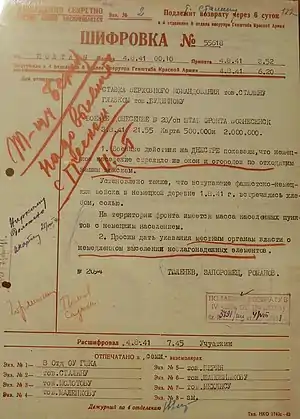 1. Военные действия на Днестре показали, что немецкое население стреляло из окон и огородов по отходящим нашим войскам. Установлено также, что вступающие немецко-фашистские войска в немецкой деревне 1.8.1941 встречались хлебом-солью. На территории фронта имеется масса населенных пунктов с немецким населением.
