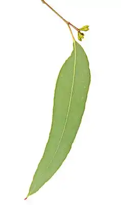 Молодые листья супротивные, сидячие или короткочерешковые, округло-сердцевидные, яйцевидные или эллиптические до ланцетных, длиной 3—8 см, шириной 3—6 см, тупые, реже остроконечные или зазубренные, сизоватые. Промежуточные листья очерёдные, черешковые, от удлинённо-яйцевидных до широко ланцетных, длиной 8—21 см, шириной 4,5—9 см, кожистые, зелёные или тёмно-зелёные. Взрослые — очерёдные, черешковые, ланцетные или узко ланцетные, иногда слабо серповидно-изогнутые, длиной 8—15 см, шириной 1,5—3 см, заострённые, с обеих сторон зелёные.